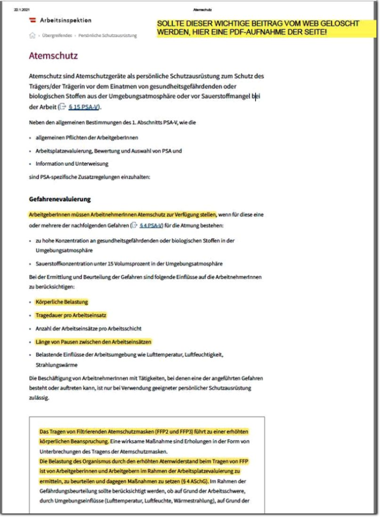 Kürzlich wurden wir zu unten angeführten Link befragt. Hier wird an offizieller Stelle (österreichische Arbeitsinspektion)das Tragen einer FFP2 Maske auf 75min. mit anschließender 30min. Pause bei leichter, stehender Arbeit beschränkt! Bei Menschen mit Herz-Kreislauferkrankungen, Blutdruckbeschwerden, Atemwegsbeschwerden, Asthma Erkrankung aber auch bei alten Menschen könnte das Trage (eines Nasen-Mundschutz) besonders einer FFP2 oder FFP3 Maske zu nachhaltigen Problemen führen. Dass darüber nicht aufgeklärt wird und trotzdem eine allgemeine Tragepflicht verhängt wird, ist zumindest bemerkenswert. Das Arbeitsinspektorat stellt auf ihrer Webseite deutlich klar: Das Tragen von Filtrierenden Atemschutzmasken (FFP2 und FFP3) führt zu einer erhöhten körperlichen Beanspruchung. Die Letzte Änderung der Webseite der Arbeitsinspektion erfolgte am 19.11.2020.