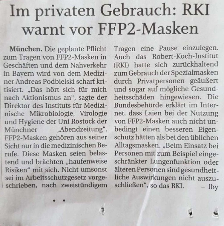 Auch das Rober Koch Institut (RKI) warnte schon vom Gebrauch der FFP2 Masken