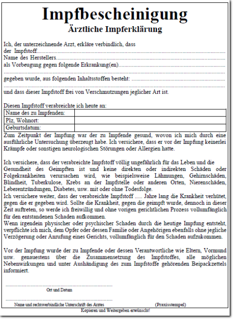 Hinweis: Wenn alles wirklich einwandfrei und ohne Risiko (für Patient und Arzt) ist, so kann der Arzt die nachfolgende Impfbescheinigung problemlos ausfüllen und unterfertigen!