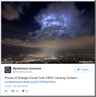 Während eines Experiments soll sich demnach der Himmel über dem LHC-Laboratorium purpurn verfärbt haben, in den Wolken entstanden Wirbelwinde. Einige Beobachter glaubten überirdische Erscheinungen, Geschichten und Theorien über das Phänomen wurden in den letzten Tagen im Umlauf gebracht, wie z.B. dass sich im Himmel über der Schweiz das Tor in eine neue Dimension aufgetan hat.