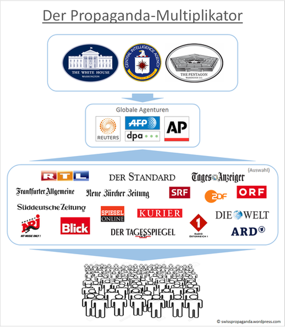 Die Forschungsgruppe zu Propaganda in Schweizer Medien veröffentlichte kürzlich eine umfassende Studie mit dem Titel „Der Propaganda-Multiplikator“. Darin wird vor allem die Rolle von global agierenden Nachrichtenagenturen in Hinblick auf ihre Berichterstattung untersucht. Als Beispiel wurde etwa die Syrien-Berichterstattung in Deutschland, Österreich und der Schweiz herangezogen. Fazit: Der größte Teil der internationalen Nachrichten in all unseren Medien stammen von nur drei globalen Nachrichtenagenturen.