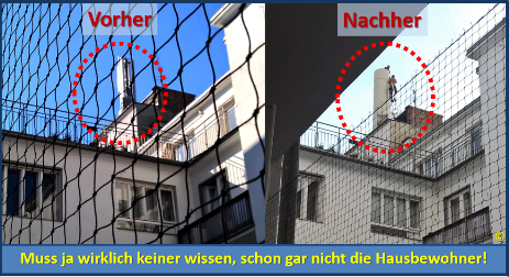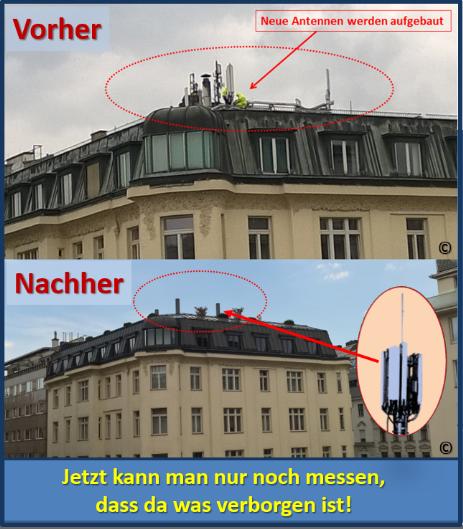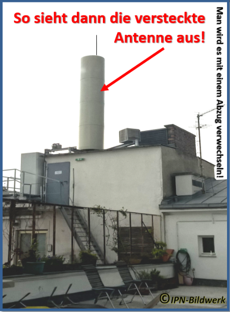 Deutschland - dutzende Beispiele hat das Umweltinstitut allein in München zusammengetragen: Die Anlagen sind auf Litfaßsäulen und in bunten Werbeträgern installiert, wie ein Rauchfang ummantelt (siehe Bild) oder umgebungsgerecht im Rot der umliegenden Dachziegel gestrichen. Die Antennen seien häufig so unauffällig eingebaut, dass sie sogar für Experten nicht leicht zu finden sind. Anm.: Da muss man schon messen. Zeigt das Messgerät erhöhte Werte an, kann man sich dann auf die Suche nach einer versteckten Antenne machen!