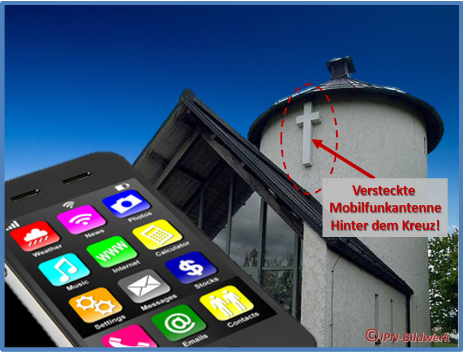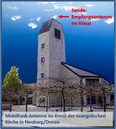 Vor allem in Kirchenkreuzen versteckte Antennen sorgten für großen Wirbel in der Bevölkerung (was nicht nur ungesund sein kann, sonder auch kein großes Feingefühl der Verantwortlichen zeigt. Es geht halt um Geld). Als Beispiel dient das in Neuburg an der Donau installierte Antennensystem im Kreuz. Die Sende - und Empfangsantenne ist im Kreuz auf dem Dach der evangelischen Apostelkirche verborgen. Ein weiteres Beispiel in Schwabhausen im Landkreis Dachau steckt eine Empfangs- und Sendeantenne in einem Kruzifix, direkt an der Aussegnungshalle der Gemeinde. Hinweis: Nach Protesten wurden die Verträge für die Masten inzwischen wieder gekündigt. In Neuburg an der Donau