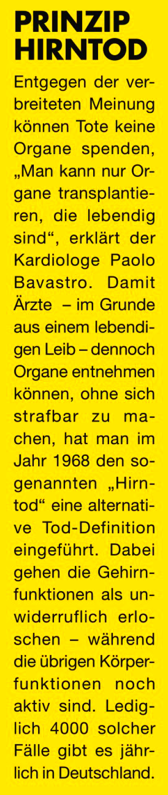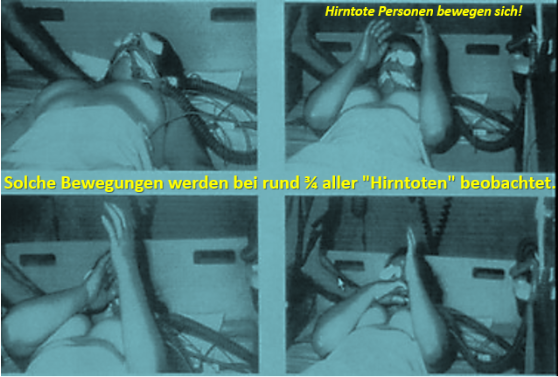 Wie tot sind Hirntote wirklich?Der Hirntod ist derzeit die Voraussetzung für die Entnahme von Spenderorganen. Doch die Frage, ob mit dem diagnostizierten Hirntod tatsächlich das Leben aufhört, ist nicht eindeutig zu beantworten bzw. auch nicht eindeutig und nachhaltig untersucht worden. Neue wissenschaftliche Untersuchungen zeigen, dass ein vermeintlich lebloses Hirn noch erstaunlich viel kann. Und nicht selten erwachen Hirntote wieder zum Leben, ohne nachhaltige, geistige und körperliche Schäden davon zu tragen. Natürlich ist noch keine/keiner erwacht, nachdem man dem scheinnbar Toten die Organe entnommen hat, denn diese Entnahmen töten sicher.