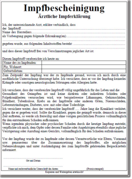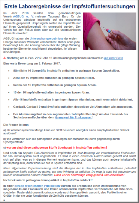 Heute werden Impfstoffe auch zunehmend gentechnisch hergestellt. Langzeituntersuchungen über die Sicherheit dieser Stoffe liegen noch nicht vor und werden vermutlich auch in absehbarer Zeit nicht vorliegen, das es zu konventionellen Impfungen auch noch keine Langzeituntersuchungen gibt.