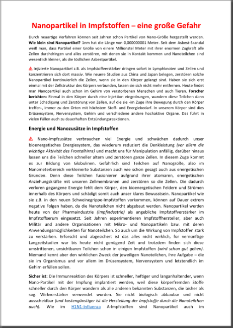 (Es besteht sogar der Verdacht das NANO-Teilchen -wie NANO-RFID-Chips- zu Markierungszwecken in neuen Impfstoffen enthalten sein könnten. Keiner weiß und kann aktuell überprüfen, was gerade gespritzt wird!)