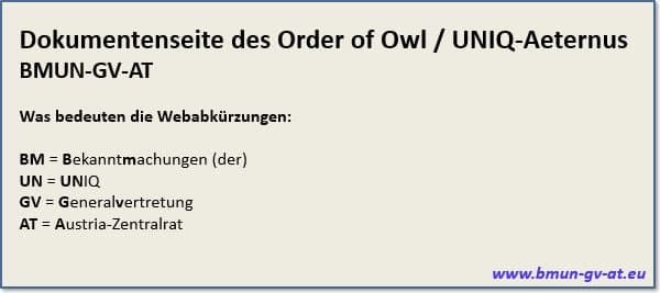 Anmerkung Order of Owl (UNIQ-Aeternus) Rechtsbüro: Im Einklang mit dem E-Commerce-Gesetz (eCG), was auf diesen Seiten und die BLOG-Seiten an sich NICHT zutrifft, machen wir darauf aufmerksam, dass an uns gesendete E-Mails nur zu unseren Blog-Bürozeiten (Di. und Do. von 12:30 – 16:00 Uhr) abgerufen werden, zu anderen Zeiten erfolgt die Abrufung unregelmäßig und nicht immer, ausgenommen sind auch Feiertage. Unter der Woche ist mit einer Reaktion von ca. 24 Std. zu rechnen.