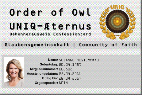 Einerseits weist er Sie als Mitglied der UNIQ-Aeternus Glaubensgemeinschaft (Order of Owl) aus, anderseits bietet der Mitgliederausweis inkl. des dazu gehörenden Schutzbriefes („Schutz des Glaubens“) den Mitgliedern den notwendigen Schutz um unseren Glauben entsprechend praktizieren zu können. Siehe dazu die Hinterseite und Vorderseite des Musterausweises und die genaue Deklaration in unseren Grundsätzen, Glaubensbekenntnis, Handlungscharta und die Deklaration der Prinzipien, wie auch die Statuten von UNIQ-Aeternus (Order of Owl), Downloadlink.