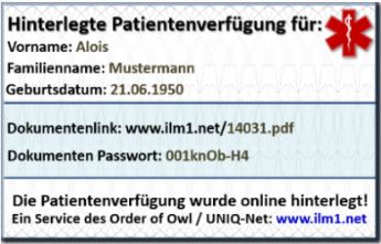Service für unsere Mitglieder: Patientenverfügung online aufbewahrenWer mit einer Patientenverfügung vorsorgen will, steht in der Praxis vor der Frage, wo und wie das wichtige Dokument aufbewahrt werden sollte. Das ist besonders wichtig, da die persönliche Patientenverfügung im Ernstfall so schnell wie möglich für Ärzte und Spitäler verfügbar sein müssen. Wenn man sich für das Abfassen einer Patientenverfügung entscheidet, dann sollte diese überall und zu jeder Zeit verfügbar sein. Eine optimale Lösung hierfür bietet die UNIQ-Net Online-Hinterlegung: So kann medizinisches Personal, jederzeit sofort, den Willen des Patienten in Erfahrung bringen.