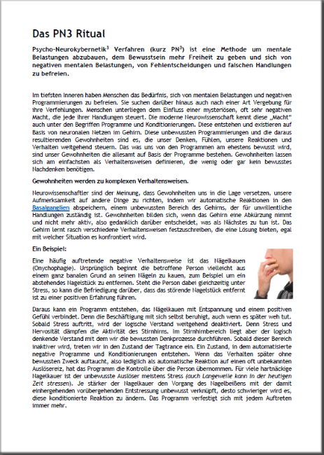 Das PN3 Ritual ist die beste Technik, um sich von seinen negativen Programmen zu lösen, sein Leben positiv verändern und es neu zu erschaffen. Es befreit uns von allen belastenden Erlebnissen und Glaubenssätzen und es söhnt uns mit uns selbst und unserem Umfeld aus.