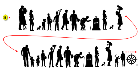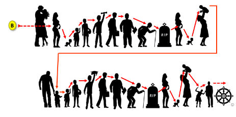 Antwort: Die falsche Vorstellung (geprägt durch unsere Glaubensvorstellungen und unsere Erziehung) führt dazu, dass wir im Kreislauf der Wiedergeburten gefangen sind: Statt nach dem Tod bewusst einen neuen optimalen Körper zu suchen bzw. zu entwickeln, der uns die besten Möglichkeiten bietet, werden wir von unterbewussten Abläufen getrieben – gefangen in einem fast endlosen Kreislauf der Wiedergeburten. Dabei verläuft der Prozess des Sterbens, bei dem sich unser Bewusstseinsstrom vom Körper trennt, immer gleich – egal, ob der Tod nach langer Krankheit oder schlagartig, zum Beispiel bei einem Unfall, eintritt.