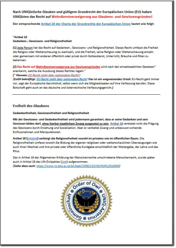 UNIQisten können aus Glaubensgründen in Österreich und Deutschland wie auch in vielen anderen Ländern NEIN sagen, das ist unser Recht:Recht auf Wehrdienstverweigerung aus Glaubens- und GewissensgründenNach UNIQistische Glauben und gültigem Grundrecht der Europäischen Union (EU) haben UNIQisten das Recht auf Wehrdienstverweigerung aus Glaubens- und Gewissensgründen! Nicht vergessen den aktuellen UNIQ-Mitgliederausweis immer bei sich tragen!Nein, unsere Söhne und Töchter kriegt ihr nicht!