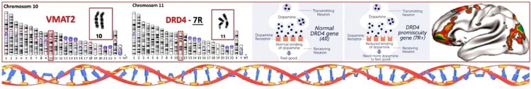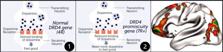 Dopamin, als wichtiger chemischer Botenstoff, spielt neben dem Neurotransmitter Serotonin in unserem Lern- und Belohnungszentrum des Gehirns eine übergeordnete Rolle, wenn es um das positive Erleben geht. Den Ergebnissen der Forscher zufolge sind Menschen, die dieses spezielle Gen in sich tragen, häufiger ruhe- und rastlos als Menschen, die diese Gen-Mutation nicht haben. Zudem ist bei Menschen die die Genvariante DRD4-7R aufweisen, eine erhöhte Risikobereitschaft und die generelle Neugier stärker ausgeprägt als bei anderen.